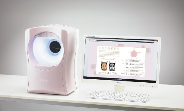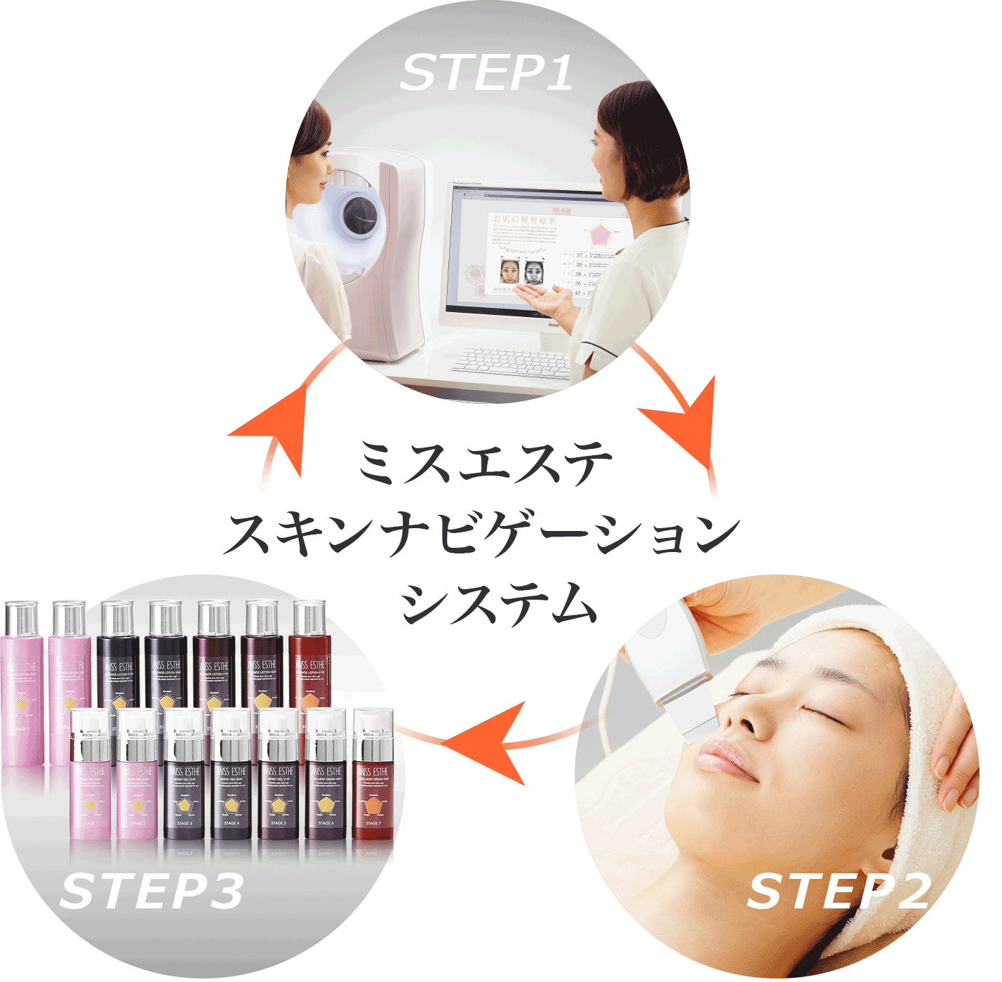 ミスエステ スキンナビゲーションシステムは、オリジナルの肌解析によりトラブル別の肌年齢と解析肌年齢を導き出して、 お客様に最適なフェイシャルトリートメントコースとホームケア化粧品をご紹介する新発想のカウンセリングシステムです。